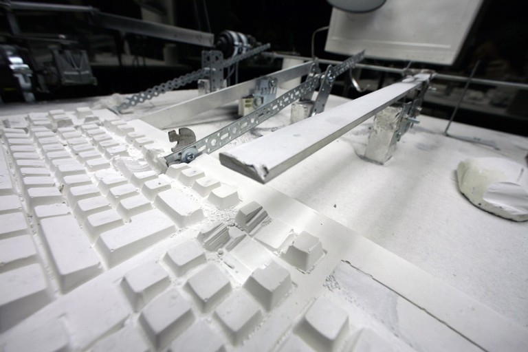 Mon-O-Matic is a model of a manufacturing plant without a control centre. It is a prototype that represents the social modes of production. Mon-O-Matic is based on the research of the cognitive precariate's labour practices, which are characterized by the repetition of automatized motion as part of the human - machine relationship. The model is based on "infinite" multiplication of the manufacturing plant, including all of the entailed office equipment (a computer screen, a table, a chair, writing implements, a book, a computer mouse & keyboard, etc).