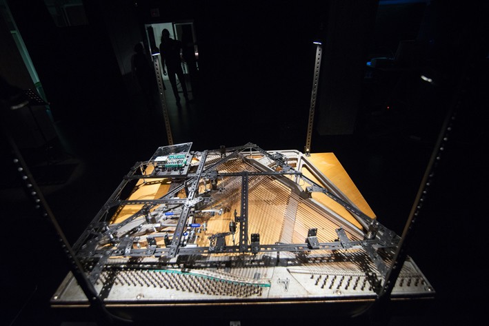 The Game is an interactive sound installation merging the features and principles of card playing (Rummy), instrument playing and musical improvisation into a temporary performative situation. The Game’s system uses a digital interface to translate information gathered in the course of a card game into a command score, which prescribes the way differingly designed motors play on piano strings and shape a unique space for playing music in the structure of a table game.